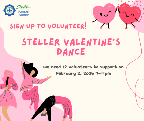 The Steller Valentine’s Day Dance is coming up February 2, 7-11pm! We need 12 volunteers to support our students. Sign up here: https://www.signupgenius.com/go/10C0849AEA62BABF5C43-62174381-steller